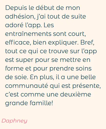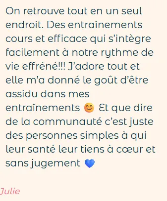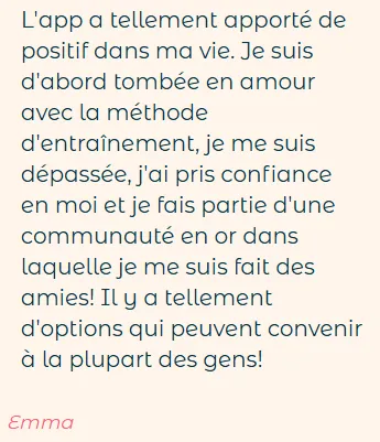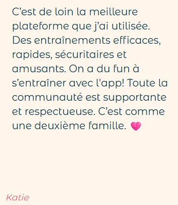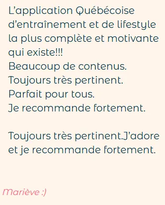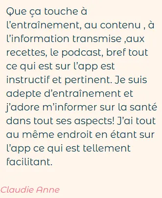 Ils offrent des entraînements de musculation, cardio, pilates, yoga, spinning, des conseils alimentation et recettes et plus encore! Il ne s'agit pas d'un programme, mais bien d'une plateforme permettant de choisir parmi les entraînements que vous aimez le plus et en fonction de votre horaire, de votre énergie et des circonstances de votre vie. Une semaine vous ferez peut-être 2 entraînements et la semaine suivante vous en ferez 6, l'application facilite une vie active tout en gérant votre agenda et surtout, d'écouter votre corps et ses besoins.