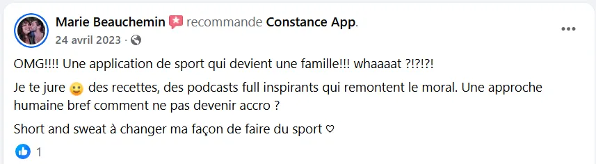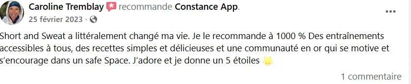 Constance App est une application en version web et mobile permettant de maintenir un mode de vie actif malgré un horaire chargé et une énergie basse. Chaque semaine, un horaire est fourni avec tous les entraînements qui ont lieu en direct (entre 5 et 10 lives par semaine). 15 minutes après l'entraînement live, la vidéo devient disponible pour le faire en rediffusion.